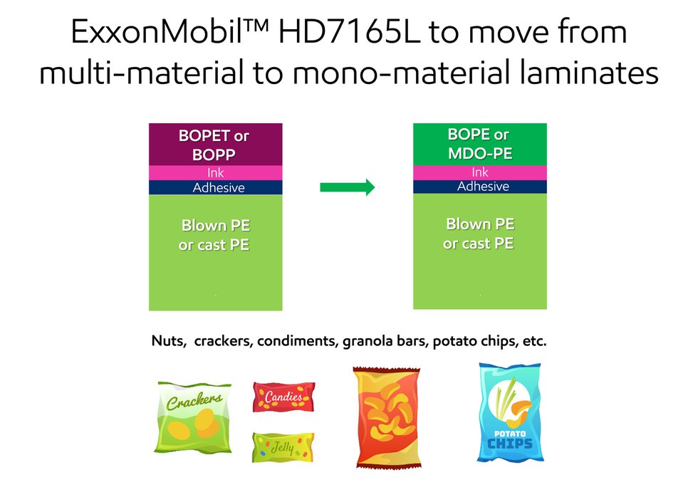 - Designed for recyclability, ExxonMobil HD7165L can help converters create mono-material MDO laminated packaging structures which: