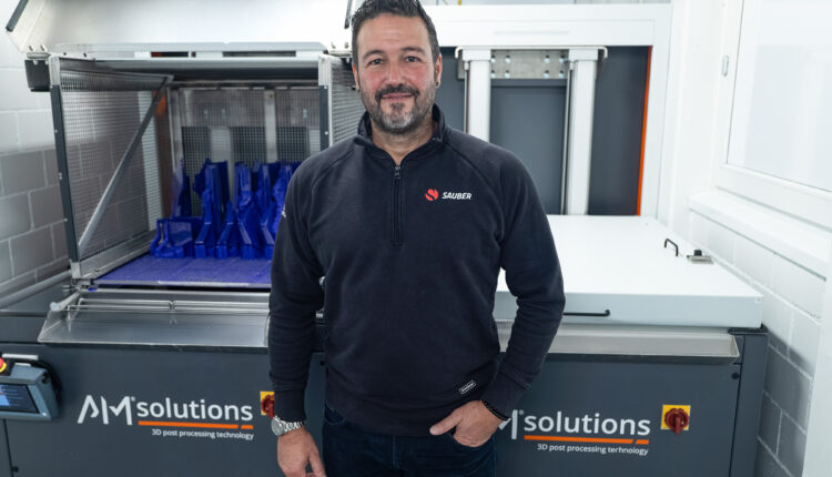 The C1 Max is based on the C1 concept and was specifically adapted by AM Solutions – 3D post processing technology to meet the needs of Sauber Motorsport for using large build platforms. SLA-printed parts are immersed in the treatment tank using an automatically lowering build plate and are surrounded by a specially temperature- controlled process fluid. A propeller, working in tandem with perfectly coordinated but individually controllable nozzles, ensures optimal flow around the parts and maximum flexibility. A mesh basket also ensures that no parts are lost or damaged in the immersion tank. The perfectly coordinated interaction of chemical, thermal, and mechanical processes softens the support structures, allowing them to be easily and gently removed. In the past, each part had to be laboriously processed by hand with a spatula, requiring extended PPE equipment. “This saves us a lot of time. We used to need an entire day to post process the output of our seven machines. Now, half a day is enough,”explains Sousa. ” Scrap is also minimized, and the surface quality is significantly higher, requiring much less effort in further post processing.”